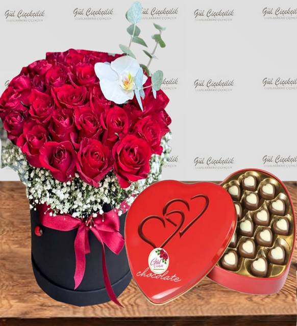 Aşkınızı en zarif şekilde ifade etmek için özel olarak tasarlanan 21 adet kırmızı gül kutusu, yanında enfes kalp çikolatalarıyla sevdiklerinizi mutlu etmenin en tatlı yolu! Şık siyah kutu içinde cipso çiçekleri, zarif beyaz orkide ve eukaliptüs yapraklarıyla tamamlanan bu aranjman, romantik ve lüks bir görünüm sunuyor.