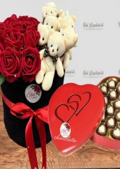Sevginizi en romantik ve özel şekilde anlatmanın yolu bu şık hediye setinden geçiyor! Lüks siyah kutu içerisinde taptaze kırmızı güller ve sevimli peluş ayıcıklarla hazırlanan bu aranjman, kalp şeklinde çikolata kutusuyla tamamlanarak eşsiz bir sürprize dönüşüyor.